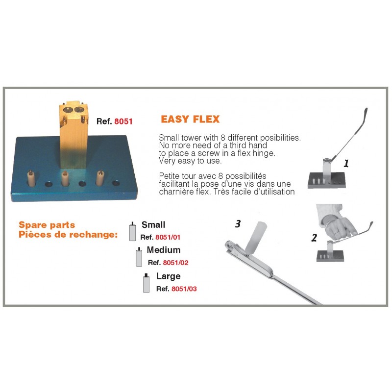 Easy flex : small tower with 8 different possibilities. No more need of a third hand to place a screw in a flex hinge. Very easy to use.