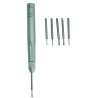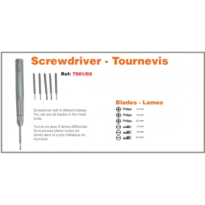 Screwdriver with 6 different blades. You can put all blades in the metal body.