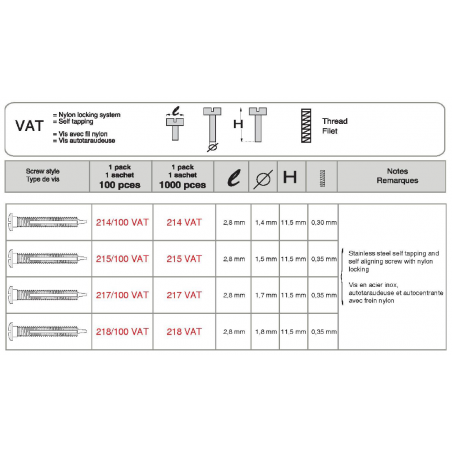 Vis en acier inox, auto-taraudeuse et autocentrante avec frein nylon.