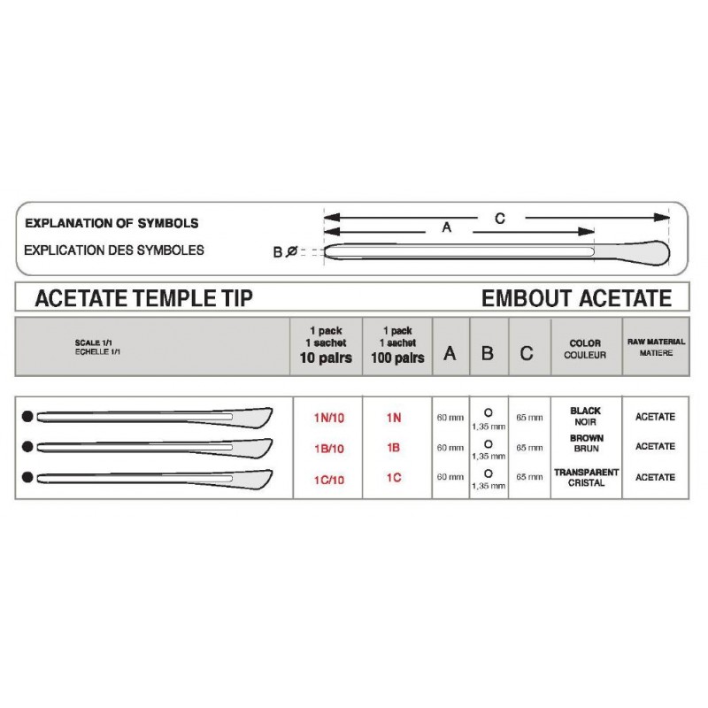 Embout en acétate, noir, brun ou transparent.