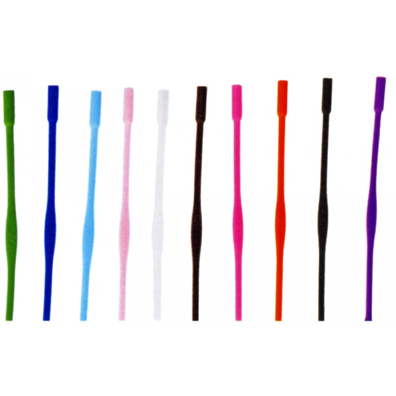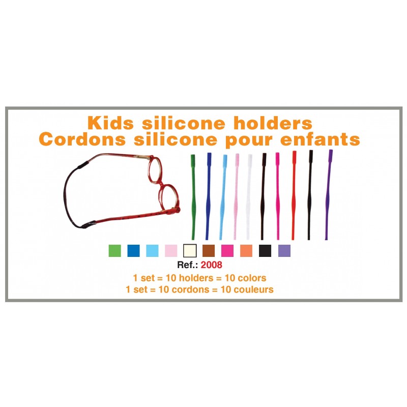 Cordons en silicone pour enfants. Un set contient 10 couleurs (vert, bleu foncé, bleu clair, rose clair, blanc, brun, rose, rouge, noir, mauve).